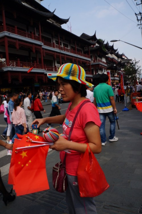 A woman selling flags for China Day